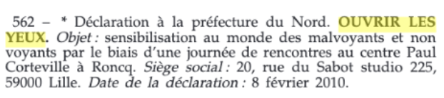 562 – * Déclaration à la préfecture du Nord . OUVRIR LES YEUX. Objet : sensibilisation au monde des malvoyants et non voyants par le biais d’une journée de rencontres au centre Paul Corteville à Roncq. Siège social : 20, rue du Sabot studio 225, 59000 Lille . Date de la déclaration : 8 février 2010.